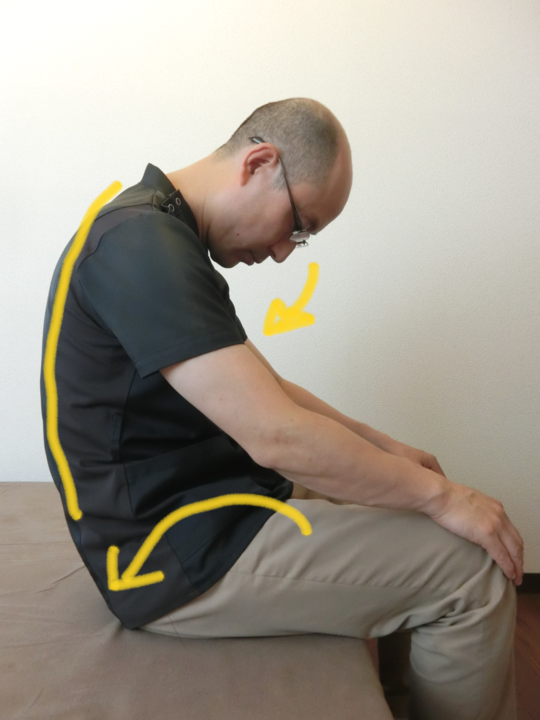 おへそを見るようにして、骨盤を後ろへ傾け、背中を丸めます。