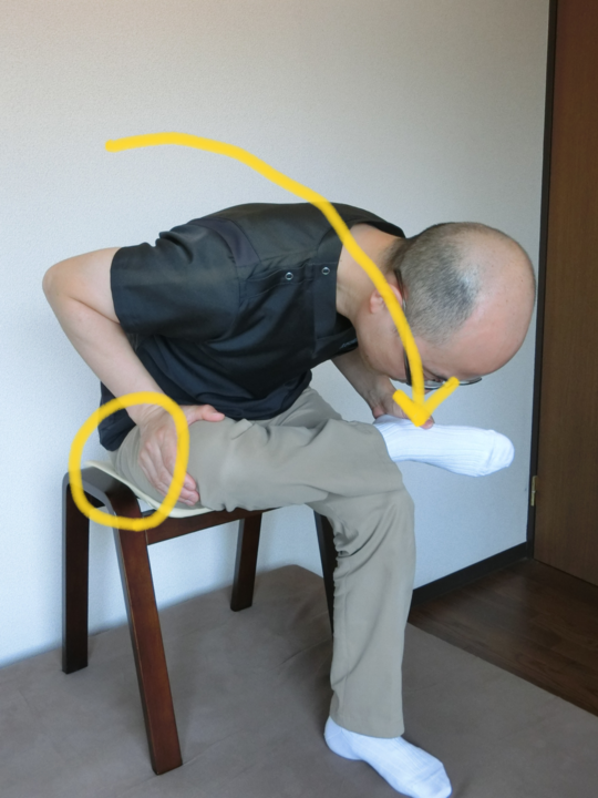 組んだ足は水平のまま、手を膝の部分と足のところにおきます。