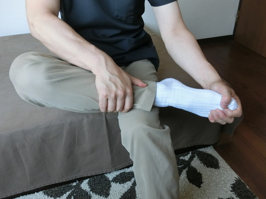 足首をつかんで固定し、反対の手でつま先を持つ。