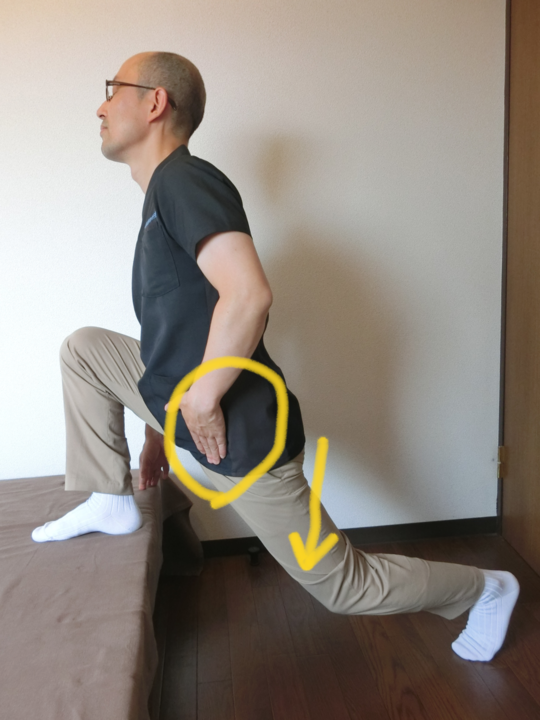 背筋をのばし、前方に体重をのせるか膝をおとすようにして、鼠径部辺りが伸びているのを感じる。