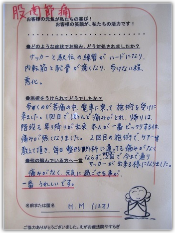 H.M様、股関節痛(グローインペイン症候群)の整体口コミ体験談ありがとうございます。