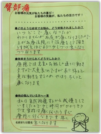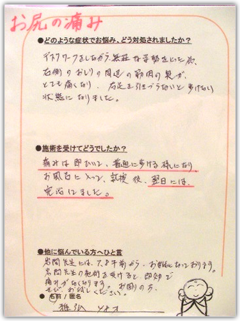 いつどこで痛くなったかわかりませんが、お尻が痛くなりましたので、えがお療法院にて治療をして頂き、うす紙をはぐように少しずつ良くなりつつあります。