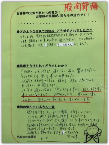 K.F様、股関節痛(変形性股関節痛)の整体口コミ体験談ありがとうございます。