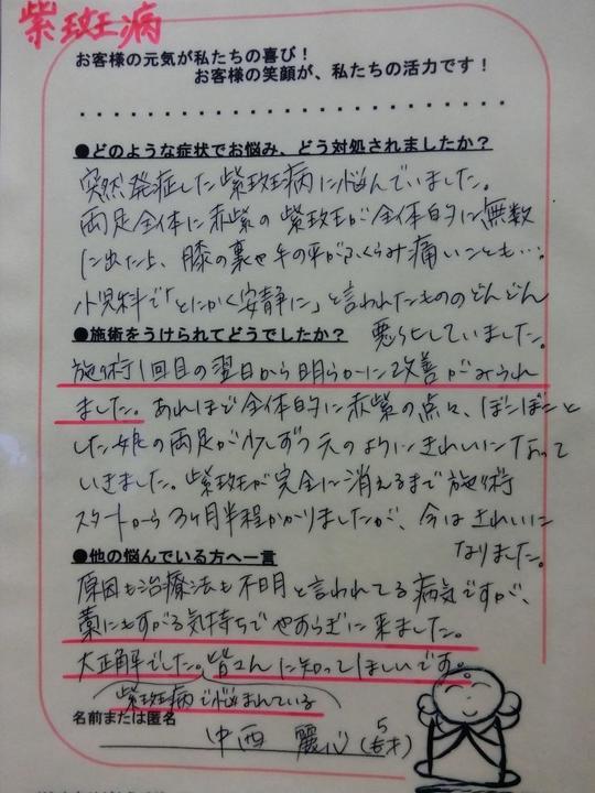中西様、アレルギー性紫斑病の整体口コミ体験談をありがとうございました。