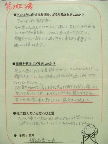 Y.O様、アレルギー性紫斑病の整体口コミ体験談をありがとうございました。