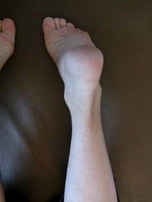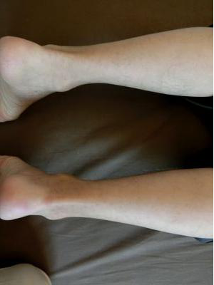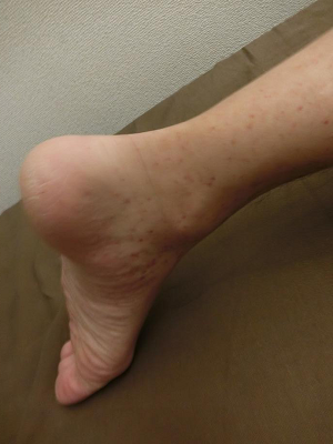 1ヶ月前ぐらいから、左のかかとの痛みがあり、歩くのが辛かった。整形外科に行くも効果なく、その後下肢に紫斑がでる。皮膚科にかかり、アレルギー性紫斑病と診断される。