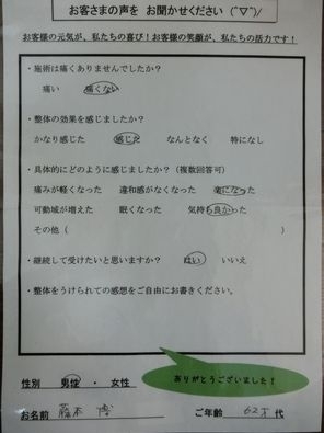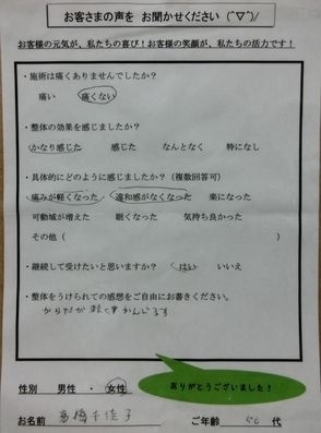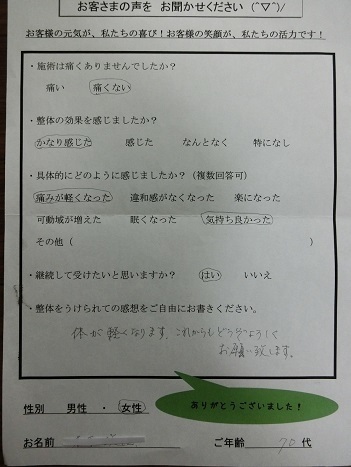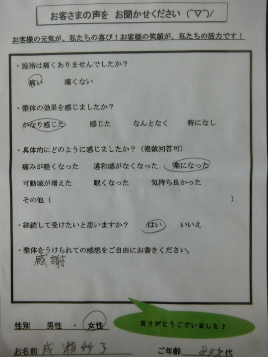 膝が悪いこともあり、足のむくみがありましたが、1回整体後は足のむくみがへり、すっきりしています。