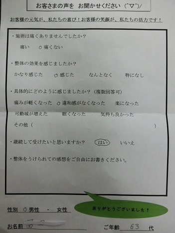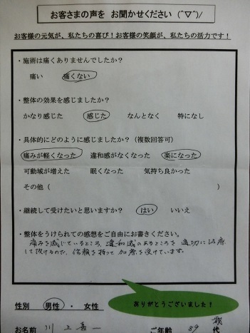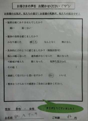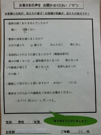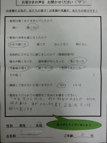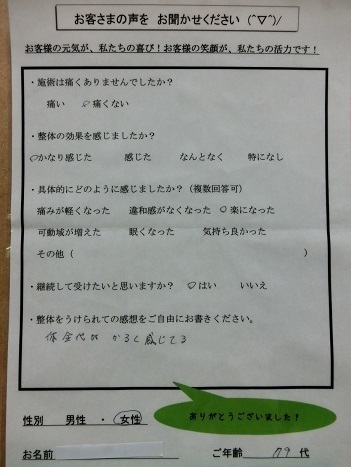 整体を受けた後は、何かすることが出来るが、何日か日があくと、身がかたくなります。正座した後に、立つ時が特に感じます。